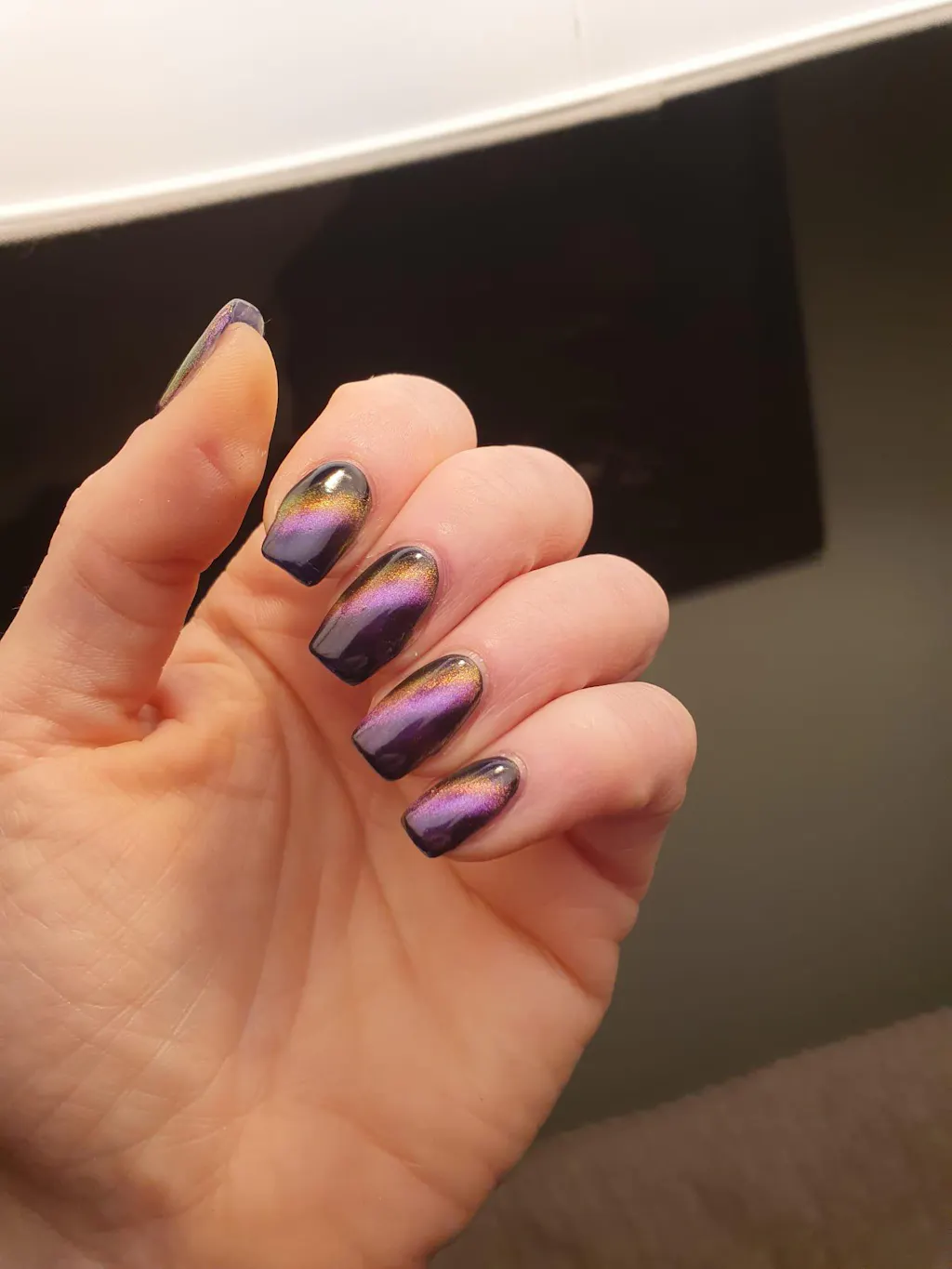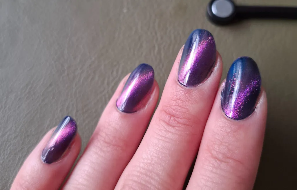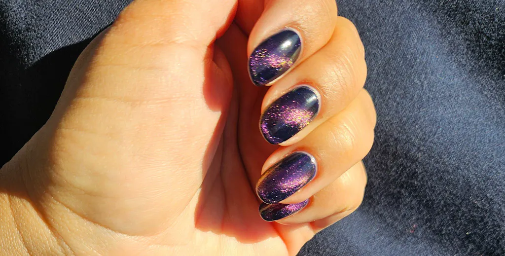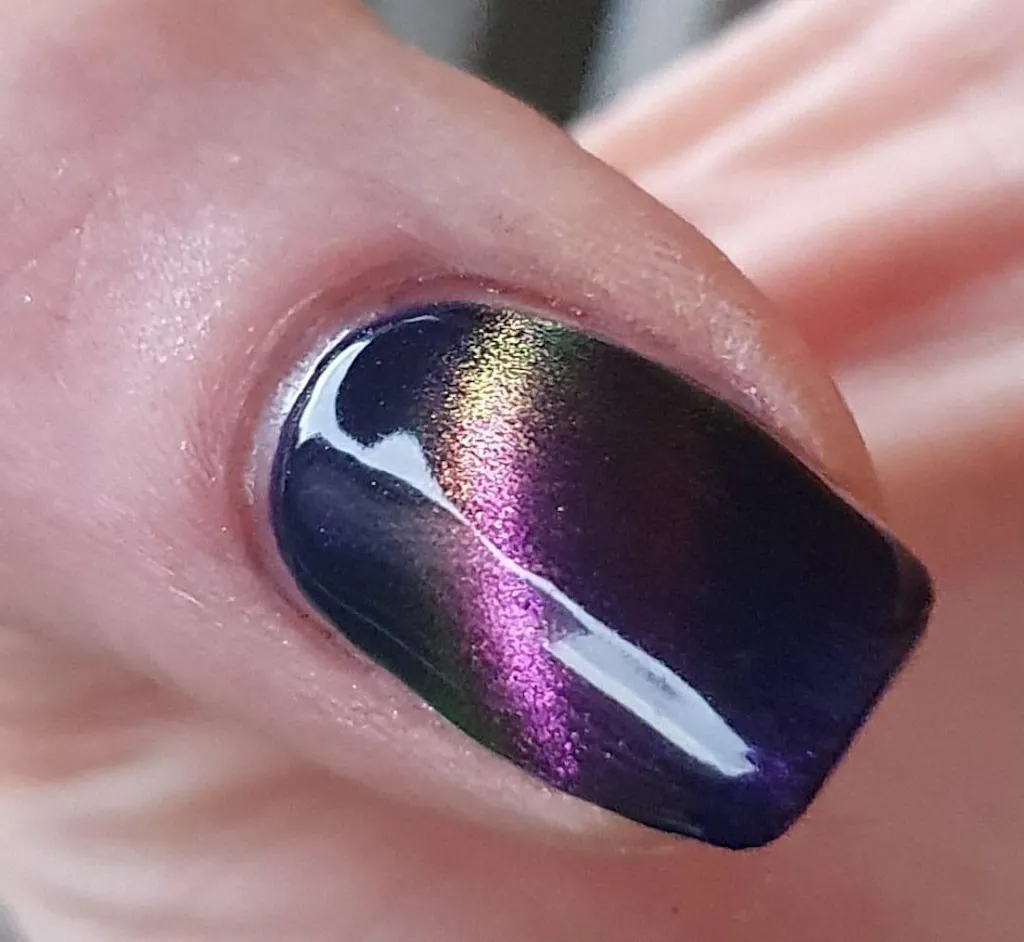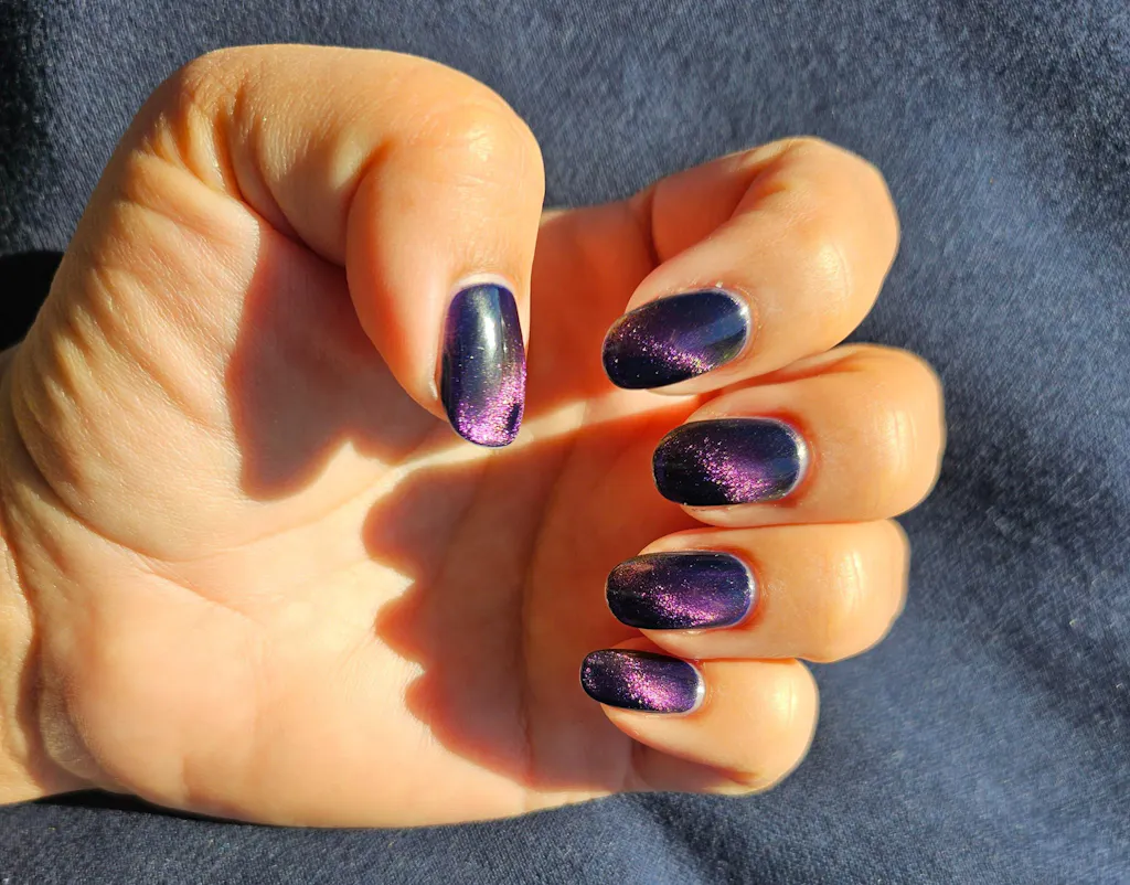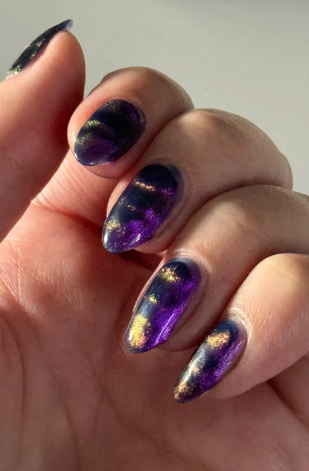 First of all, I love Dream within a dream. But if you think it's going to look indigo with an entire rainbow magnetic, you're going to be a little disappointed. I managed to get one (1) picture that looks like the bottle, but I had to take the picture in a weird angle and with the exact right lighting. Once you're over the slight sense of disappointment, you're left with a beautiful, galaxy-ish pretty purple sheer indigo base with a sparkly magnetic effect. I often use an indigo or navy basecoat to save time. It's beautiful, applies smooth and looks pretty.