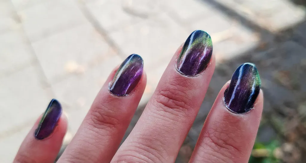 As others note too, the polish is very different than Cirque's own pictures. Nevertheless it is beautiful in its own right so only taking one star off. Lasts long and reacts strong to magnet. I tested it with the tiny magnetic blocks, that you can put together / take apart. These are weak magnets, but the polish still reacted beautifully!