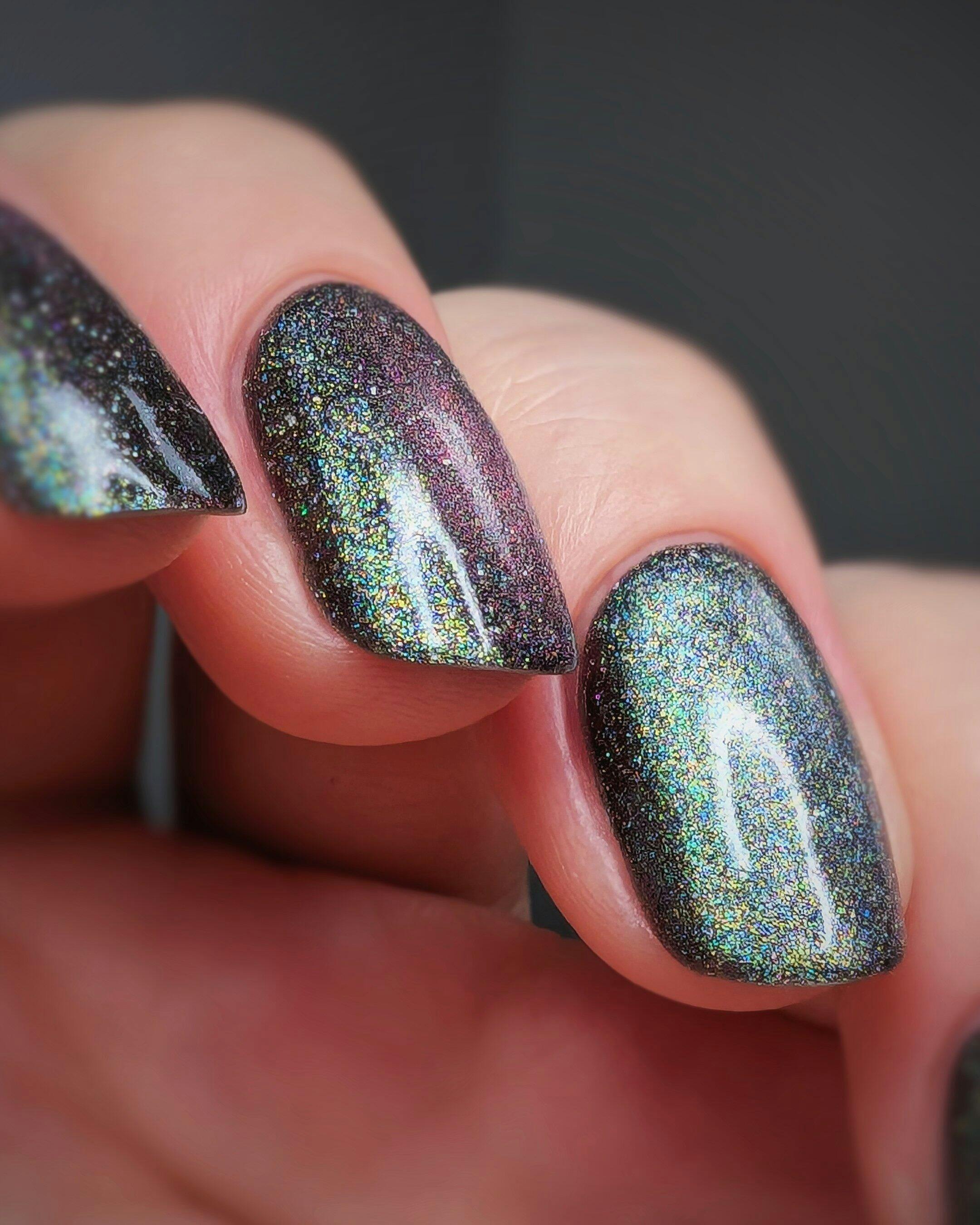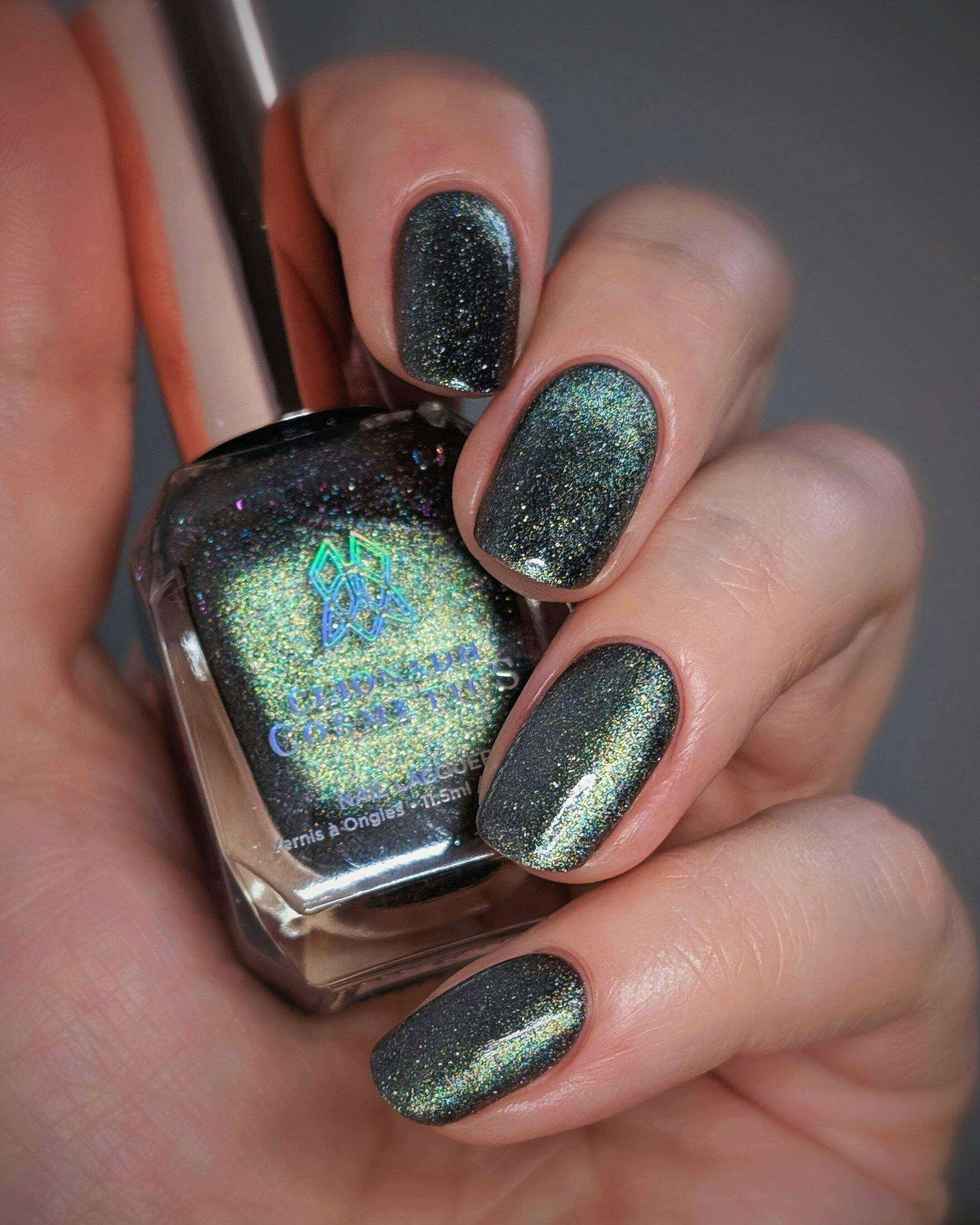 Clionadh Cosmetics tombstone nail lacquer is a mysterious midnight stunner. This ancient mossy green static slick-adelic like magnetic has a night sky backdrop scattered with reflective micro-glitter and holographic micro-flakes. Use the magnet wand - sold separately - while the polish is wet to activate the magnetic particles for a knockout cosmic effect. So are you going for edgy sparkle? Put on your tombstone nail lacquer for all that moody glam.