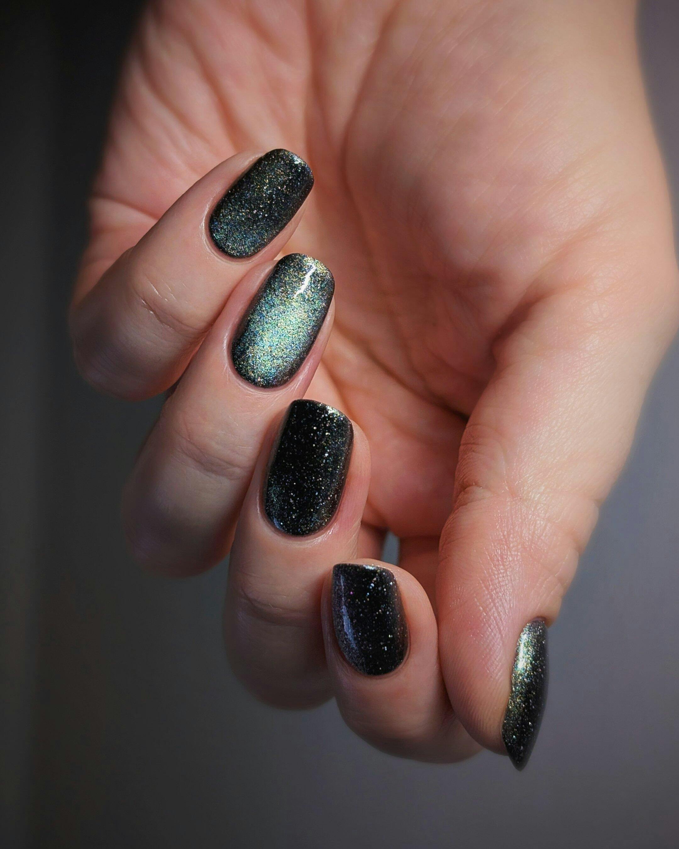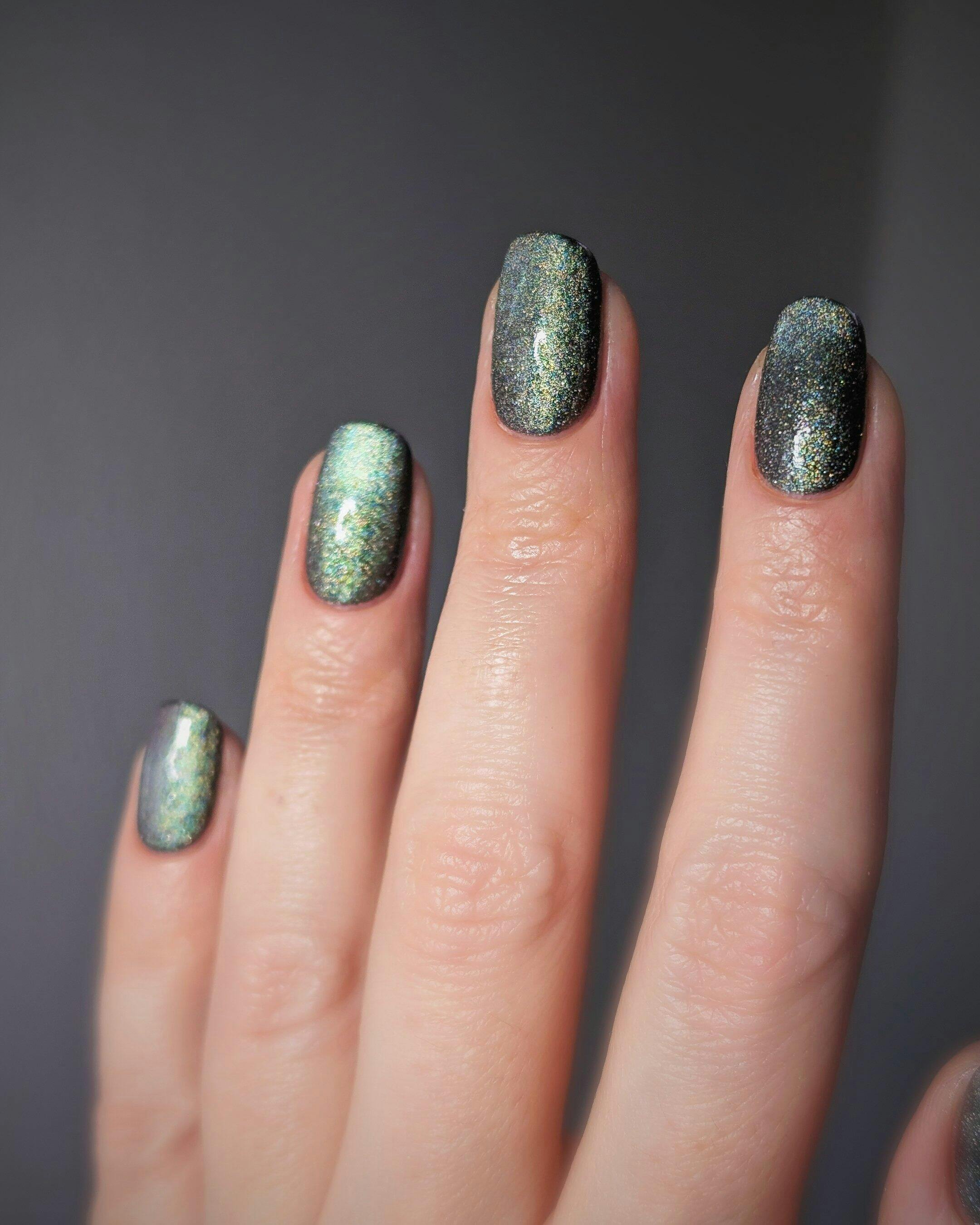 Deze vind ik nu echt perfect wanneer je even geen felle kleuren wil dragen, maar wel graag iets speciaals wil. Hij is donker maar flasht een prachtige kleur lichtgroen en ook een beetje lavender/roze. De lak zit ook nog eens vol met hele fijne multi-gekleurde glittertjes. Hij lakt heel makkelijk en de glitter zorgt ook niet voor textuur. Het magnetische pigment reageert ook heel makkelijk op de magneet. Ben hier helemaal blij mee.